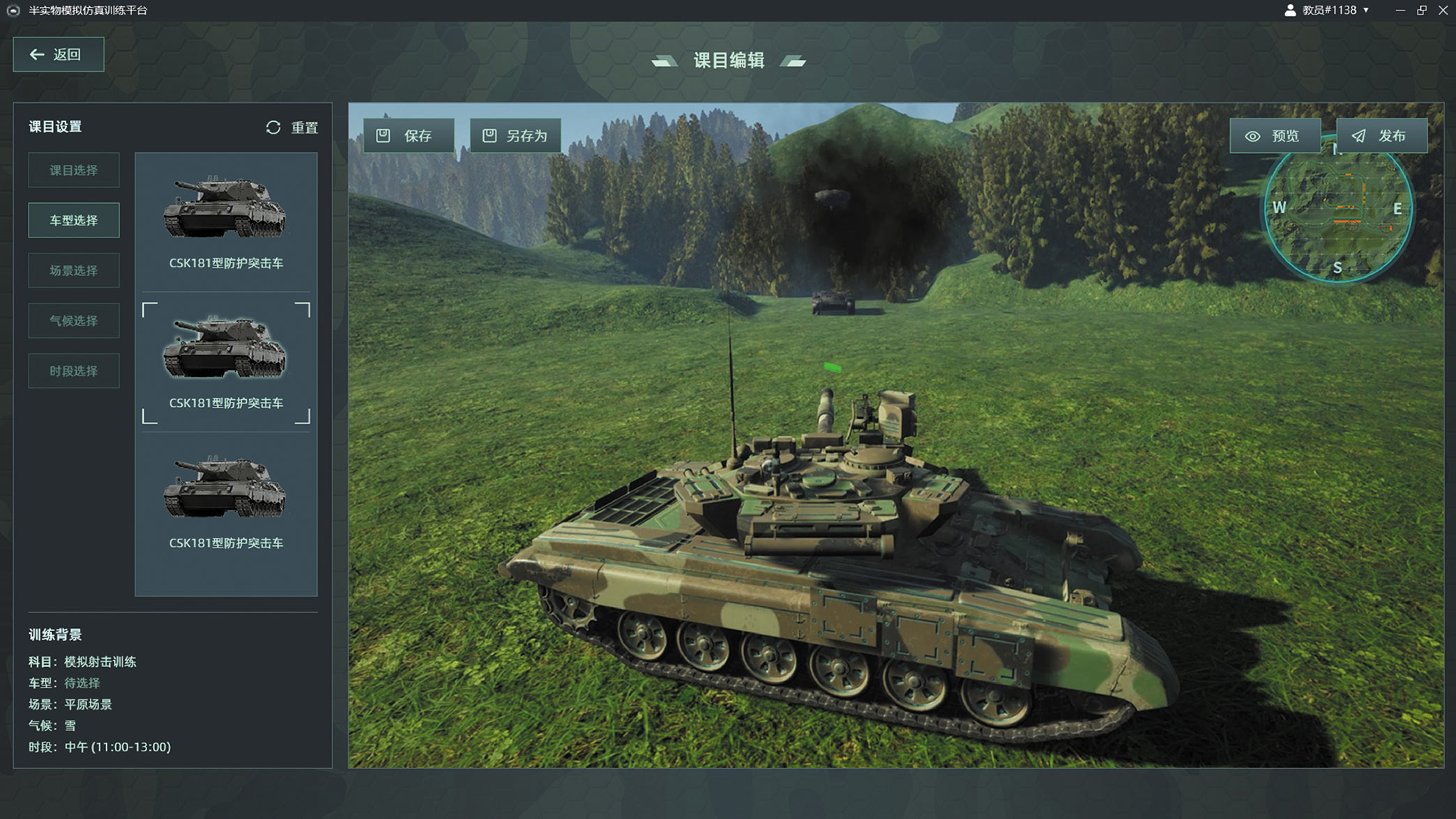 支持自定義課目駕駛車輛型號、途徑障礙路段等,不僅如此,還可以指定不同的天氣情況、訓(xùn)練時段等,最大程度上訓(xùn)練學(xué)員在極端條件下的駕駛能力。