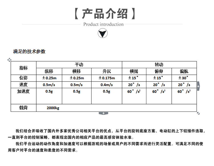 我們結合并吸收了國內外多家優秀公司相關平臺的有點,從平臺的旋轉底座方案、電動缸的上下鉸接件選取,一直到平臺的控制策略,都表現出國內的相應產品的最高感官體驗水準。