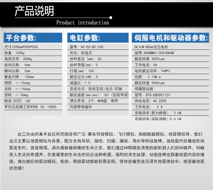 關鍵詞: 三自由度平臺,電動仿真平臺,地震模擬體驗平臺