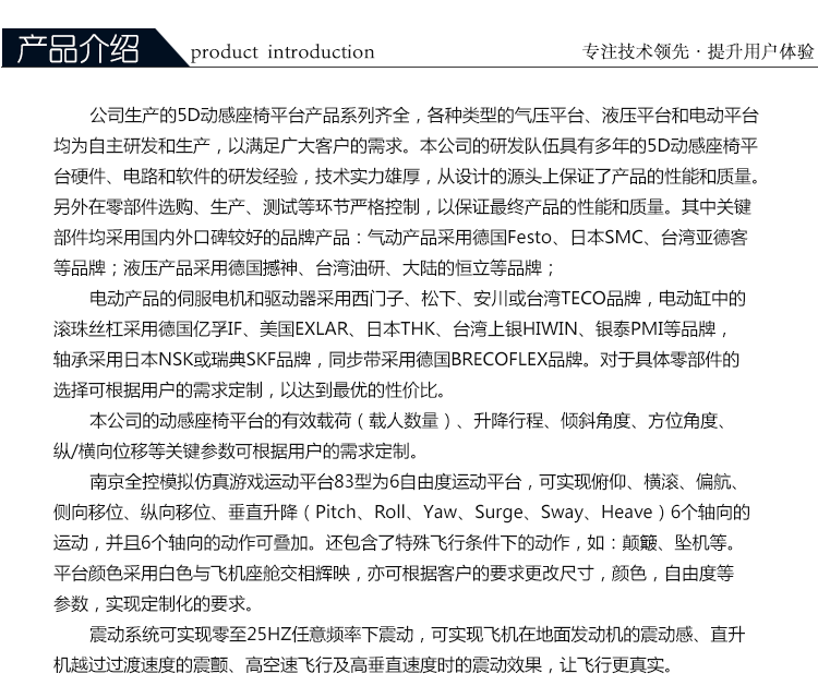 公司生產的 5D 動感座椅平臺產品系列齊全,各種類型的氣壓平臺、液壓平臺和電動平臺均為自主研發和生產,以滿足廣大客戶的需求。本公司的研發隊伍具有多年的5D 動感座椅平臺硬件、電路和軟件的研發經驗,技術實力雄厚,從設計的源頭上保證了產品的性能和質量。另外在零部件選購、生產、測試等環節嚴格控制,以保證最終產品的性能和質量。其中關鍵部件均采用國內外口碑較好的品牌產品: