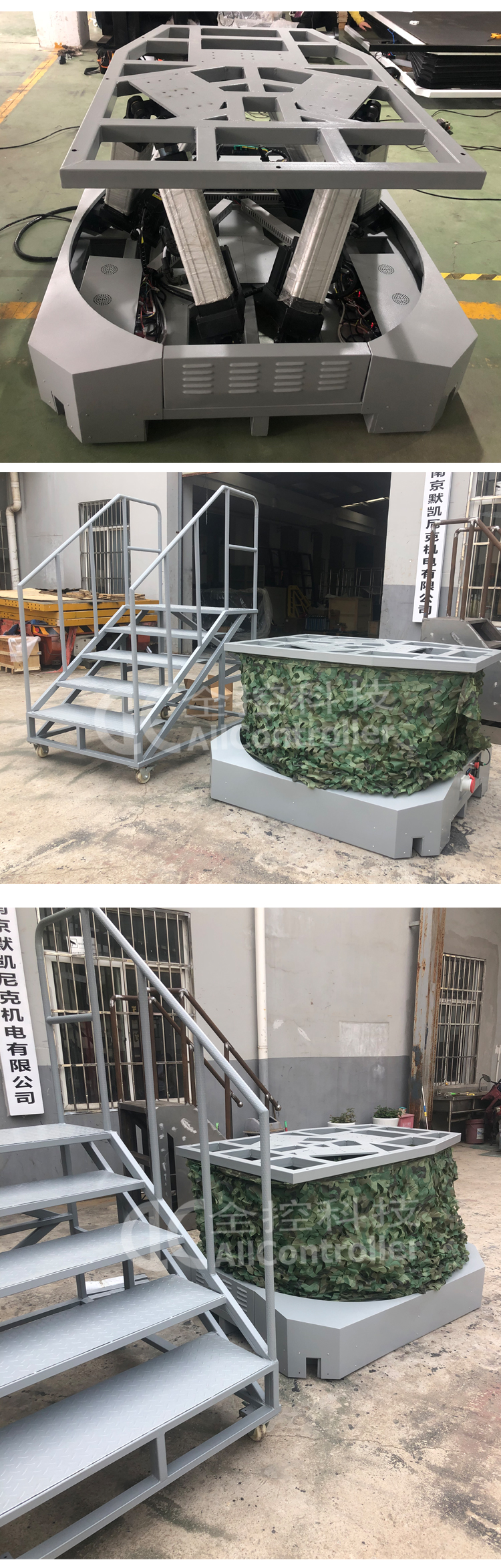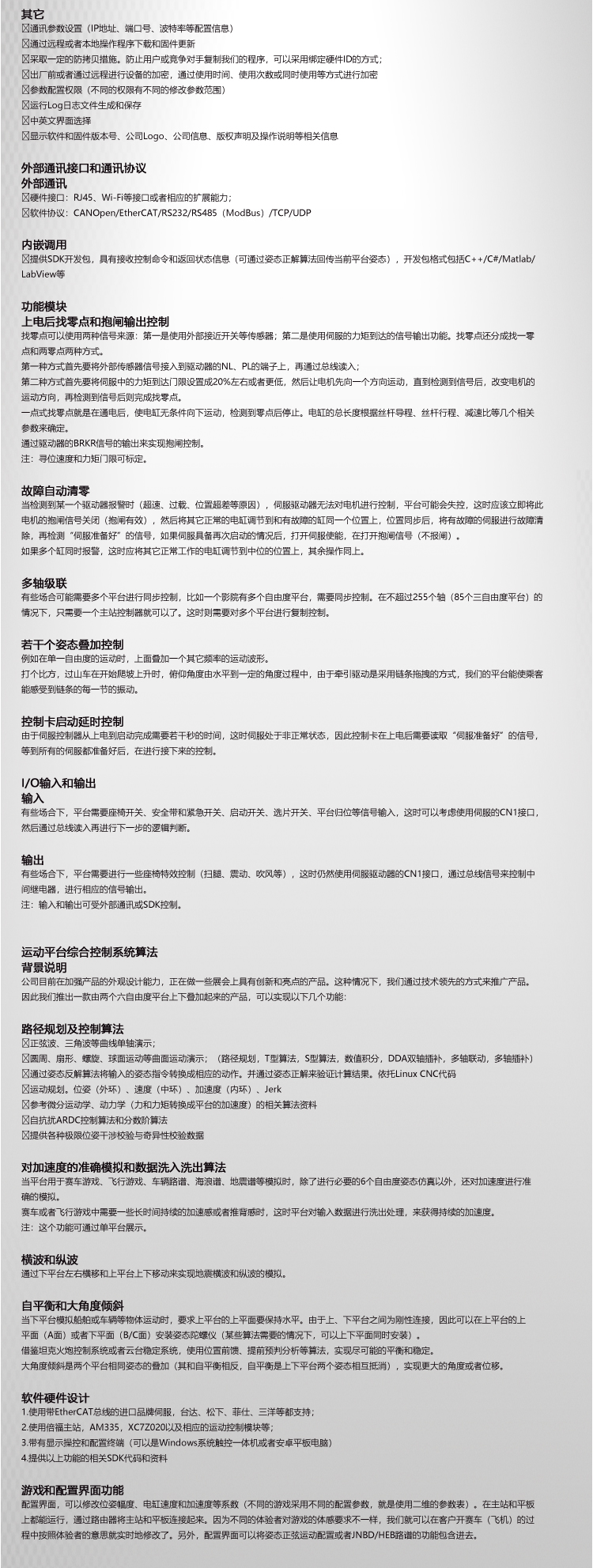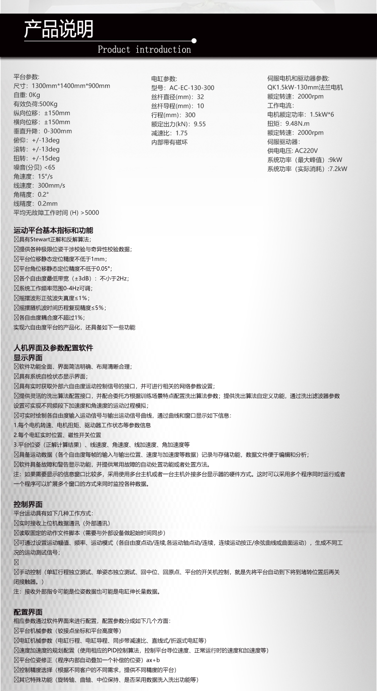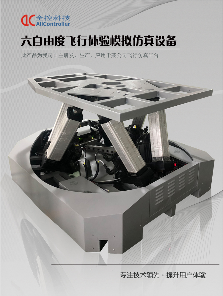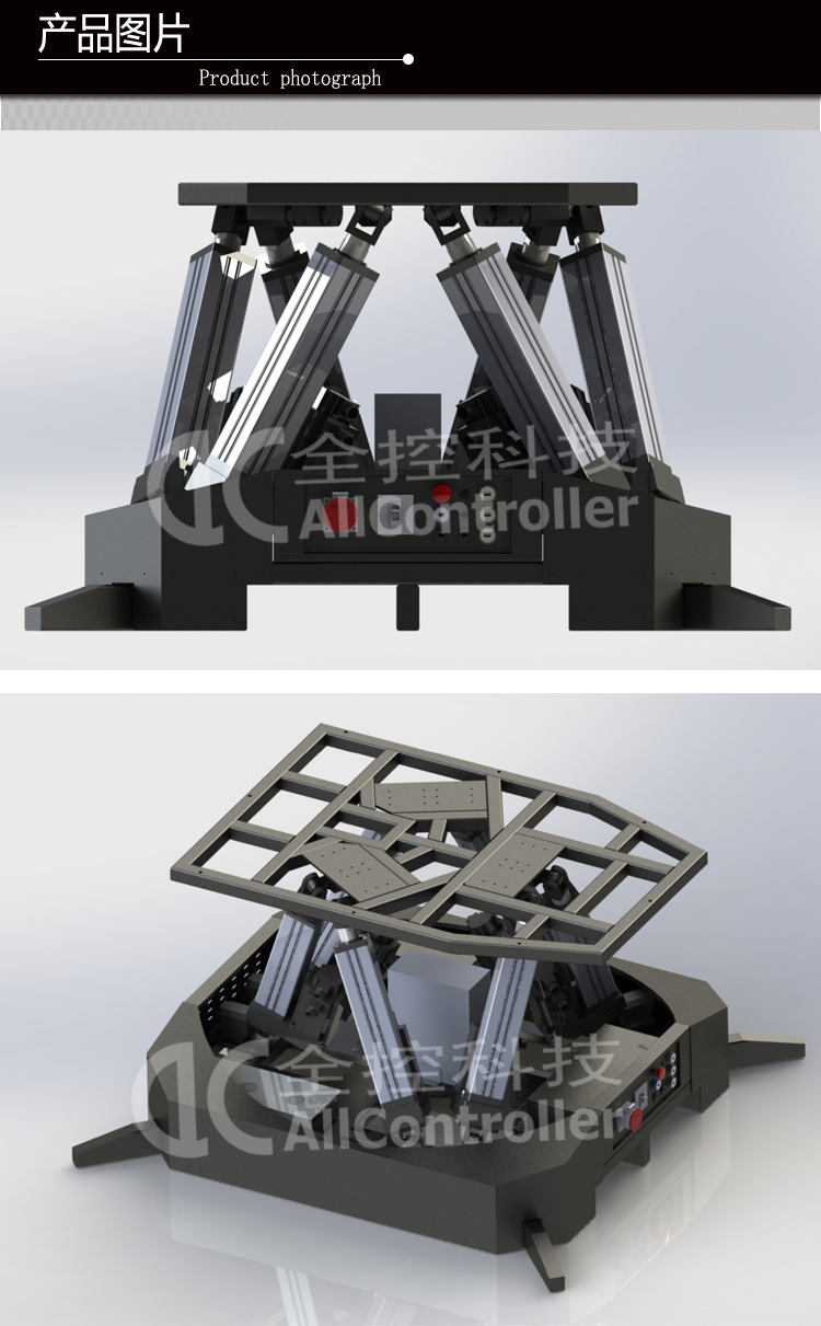 采用六自由度動(dòng)感平臺(tái)系統(tǒng),要求做到: 1、加減速、失速、滑行、滑跑、俯沖、爬升、傾斜、左偏轉(zhuǎn)、右偏轉(zhuǎn)、前后左右移動(dòng); 2、著陸接地姿態(tài)和碰撞; 3、使用剎車時(shí)出現(xiàn)的運(yùn)動(dòng); 4、起落架支柱動(dòng)態(tài)特性; 5、滑跑、垂直氣流等引起的抖振。 6、動(dòng)感平臺(tái)采用六自由度伺服電動(dòng)缸運(yùn)動(dòng)平臺(tái); 7、六自由度平臺(tái)包含以下組件: (1)6支電動(dòng)缸,單支電動(dòng)缸的行程不低于200MM; (2)6套國(guó)產(chǎn)電機(jī)及驅(qū)動(dòng)器,每套電機(jī)的功率不低于1000W,轉(zhuǎn)速不低于3000轉(zhuǎn)。 (3)六自由度平臺(tái)技術(shù)指標(biāo):