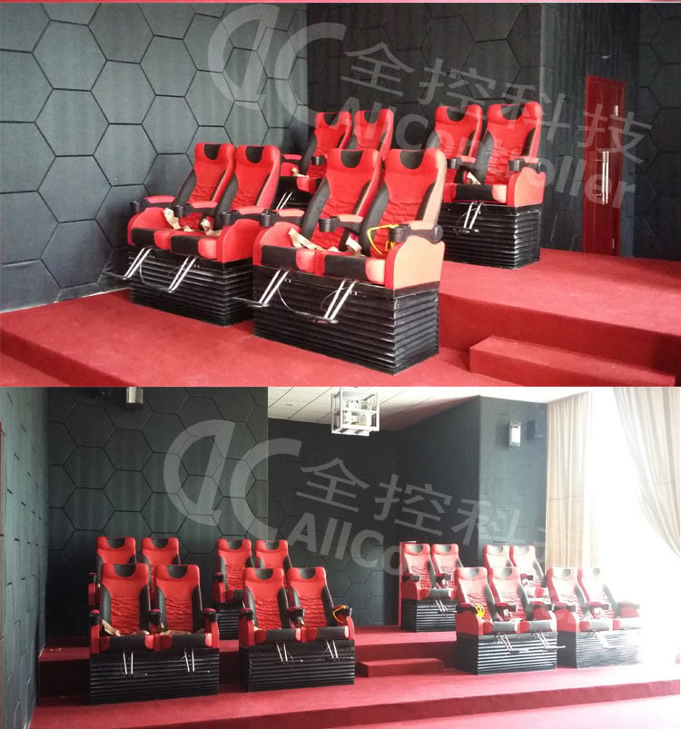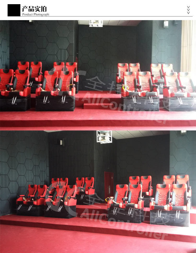 5D 影院是在3D 立體電影的基礎(chǔ)上加環(huán)境特效模擬仿真而組成的新型影視產(chǎn)品。觀眾在看立體電影時(shí),順著影視內(nèi)容的變化,可實(shí)時(shí)感受到風(fēng)暴、雷電、下雨、撞擊、噴灑水霧、拍腿等身邊所發(fā)生與立體影象對應(yīng)的事件,5D 的座椅具有噴水、噴氣、振動(dòng)、掃腿等功能。環(huán)境模擬仿真是指影院內(nèi)安裝有下雪、下雨、閃電、煙霧等特效設(shè)備,營造一種與影片內(nèi)容相一致的環(huán)境。觀眾觀看5D 電影時(shí)有身臨其境,驚險(xiǎn)刺激的感覺,同時(shí)感受科技給人們生活帶來的娛樂和趣味性。5D 動(dòng)感電影的三自由度是載體可做升降、俯仰、擺動(dòng)三種運(yùn)動(dòng)方式。每套座椅可乘坐兩人,組合方便,動(dòng)感效果好。