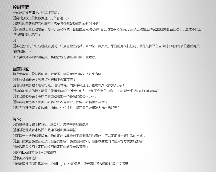 公司生產的 5D 動感座椅平臺產品系列齊全,各種類型的氣壓平臺、液壓平臺和電動平臺均為自主研發和生產,以滿足廣大客戶的需求。本公司的研發隊伍具有多年的5D 動感座椅平臺硬件、電路和軟件的研發經驗,技術實力雄厚,從設計的源頭上保證了產品的性能和質量。另外在零部件選購、生產、測試等環節嚴格控制,以保證最終產品的性能和質量。