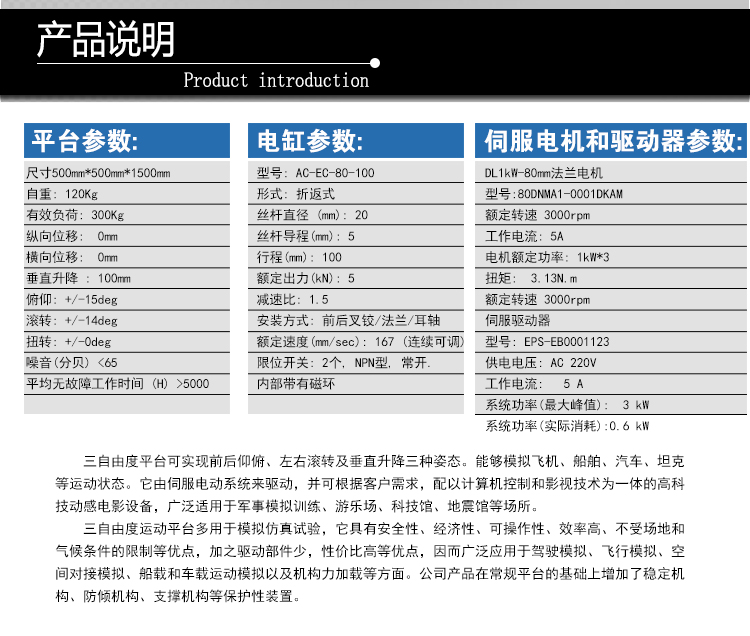 三自由度平臺可實現前后仰俯、左右滾轉及垂直升降三種姿態。能夠模擬飛機、船舶、汽車、坦克等運動狀態。它由伺服電動系統來驅動,并可根據客戶需求,配以計算機控制和影視技術為一體的高科技動感電影設備,廣泛適用于軍事模擬訓練、游樂場、科技館、地震館等場所。