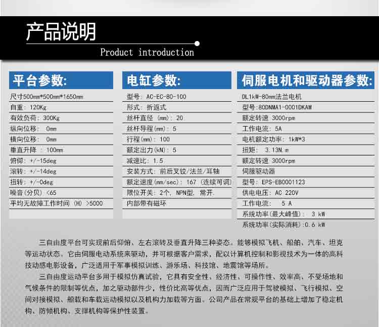技術說明:三自由度運動平臺是由三支電動缸,上、下各六只萬向鉸鏈和上、下兩個平臺組成,下平臺固定在基礎上,借助三只電動缸的伸縮運動,完成上平臺在空間三個自由度(X,Y,Z)的運動,從而可以模擬出各種空間運動姿態。三自由度平臺具有明顯的安全性、經濟性、可操作性,不受場地和氣象條件的限制和效率高等優點。