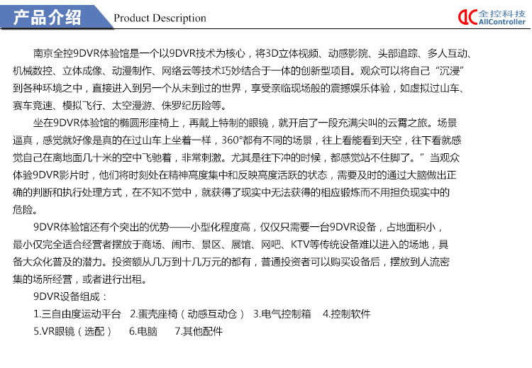 南京全控9DVR體驗館是一個以9DVR技術(shù)為核心,將3D立體視頻、動感影院、頭部追蹤、多人互動、機械數(shù)控、立體成像、動漫制作、網(wǎng)絡(luò)云等技術(shù)巧妙結(jié)合于一體的創(chuàng)新型項目。觀眾可以將自己“沉浸”到各種環(huán)境之中,直接進入到另一個從未到過的世界,享受親臨現(xiàn)場般的震撼娛樂體驗,如虛擬過山車、賽車競速、模擬飛行、太空漫游、侏羅紀(jì)歷險等。