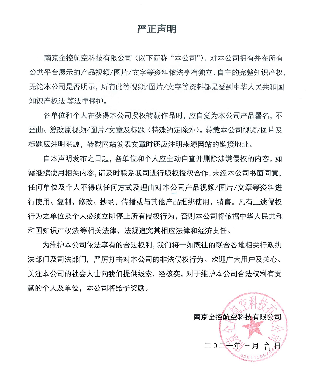 南京全控航空科技有限公司(以下簡稱“本公司”),對本公司擁有并在所有公共平臺展示的產品視頻/圖片/文字等資料依法享有獨立、自主的完整知識產權,無論本公司是否明示,所有此等視頻/圖片/文字等資料都是受到中華人民共和國知識產權相關法律法規的保護。