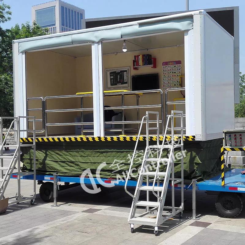 地震小屋實體:小屋放置在運動平臺上。屋頂和墻壁由鋼結構和木工板等材質混合制成,并設置地震科普知識宣傳的文字與圖畫。當地震發生時,柜里的雜物、餐桌等隨著震動來回晃動、位移,吊燈來回晃動。隨著震動的加劇,房頂上的房梁震下,天花板跌落、書柜倒下、灰塵、煙霧充滿房間。