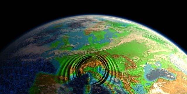 畫面為震源到地表的剖面圖,模擬地震波從震源到地表的傳遞的過程,紅色代表縱波、綠色代表橫波;根據(jù)橫波和縱波的傳播速度和時間差可以確定地震的震源距地表建筑的距離。