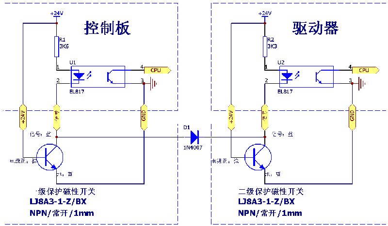 使用4磁性開關時首先要修改驅動器的參數配置,否則功能無效!磁性開關保護電路可分為兩部分: