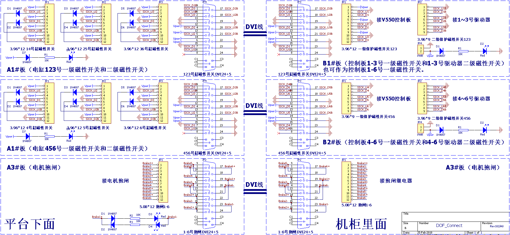 1. 第一塊A1的三個12芯插頭負責1~3號缸,其中每個插頭負責一條缸; 2. 第二塊A1的三個12芯插頭負責4~6號缸,其中每個插頭負責一條缸; 3. B1的12芯插頭連接ACB550上面的12芯插頭,9芯插頭連接1~3號伺服; 4. B2的9芯插頭(JP1)連接ACB550上面的9芯插頭,另外一個9芯插頭(JP2)連接4~6號伺服; 5. 將B1板和B2板上的7.62插頭連接到一起; 6. 機柜里面的A3板接抱閘繼電器的輸出端。抱閘兩根線不分極性。 |