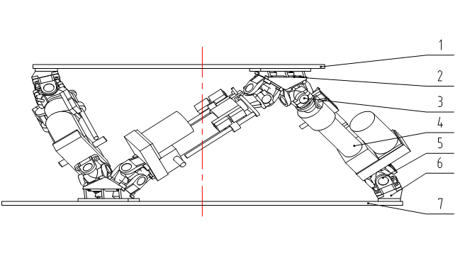 TecPlat平臺結構示意圖如圖3.2.1,它由下臺基、上平臺及并聯連接兩者的6個電動缸組成,Mechanic電動缸與上、下平臺之間分別采用球鉸/虎克萬向鉸連接(圖3.2.2),6個電動缸可在缸軸向方向作線性移動,平臺正是通過6個電動缸的協調動作來實現6自由度的運動。整體框架如圖3.2.4所示。